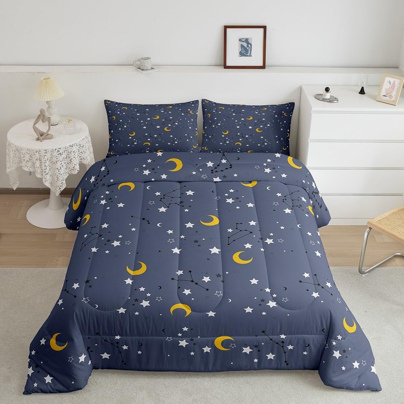Erosebridal Moon & Stars Bedding Boys Girls 3Pcs Galaxy Full Comforter Set for Kids Toddler Teen, Dreamy Moon Stars Bedding Sets Constellation Space Illustration Duvet Set with 2 Pillowcases