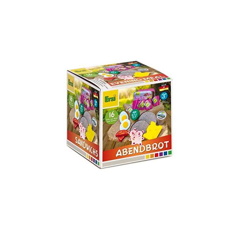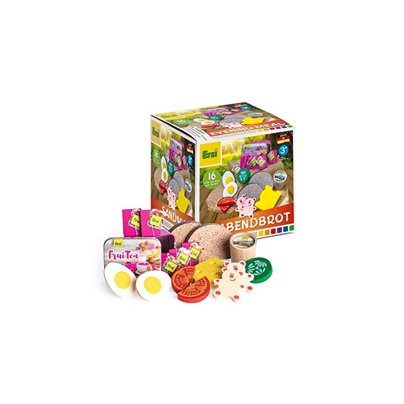 - Contents: a total of 16 pieces of wood = 2 slices of bread, 1 creamy cheese, 1 Swiss cheese, cold cuts, cucumber, tomato, 1 egg for cutting, 5 tea bags in metal tin