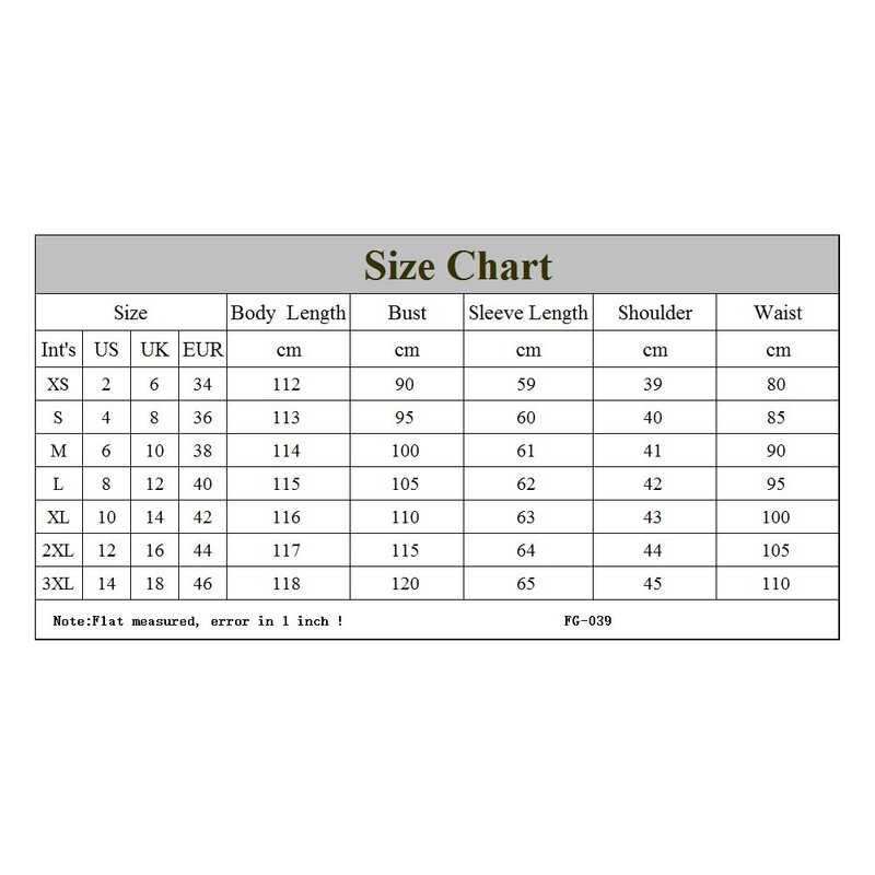 2XL:Length 46.5" | Bust 47.2" | Shoulder 17.7"|Waist 43.3"| Sleeve length 25.6" (INCHES)