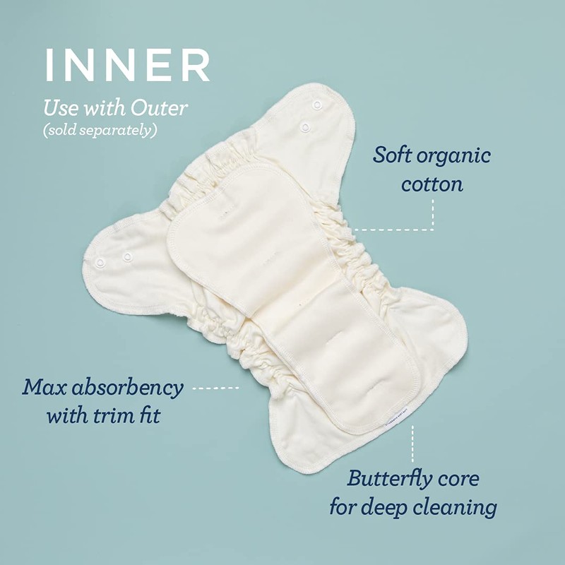 Esembly reusable cloth diapers are made up of two parts: an absorbent Inner and a waterproof Outer (sold separately). Esembly Inners are made of super soft and thirsty 100% certified organic cotton. Inners are designed with a unique butterfly-shaped core to maximize absorbency while still allowing water and detergent to access all layers of the diaper for a deep and thorough cleaning and efficient drying.