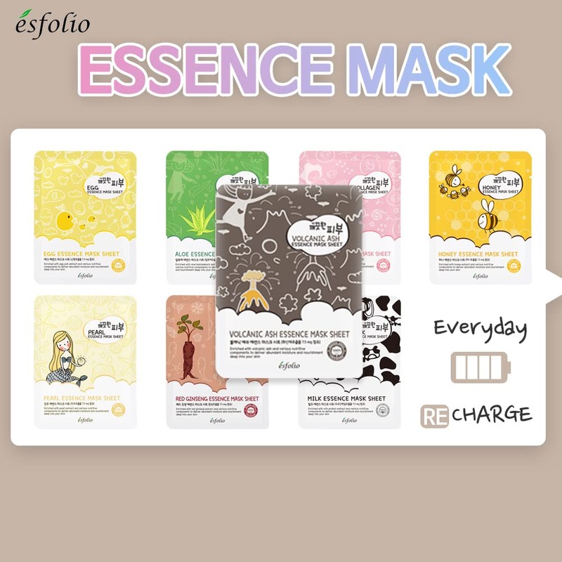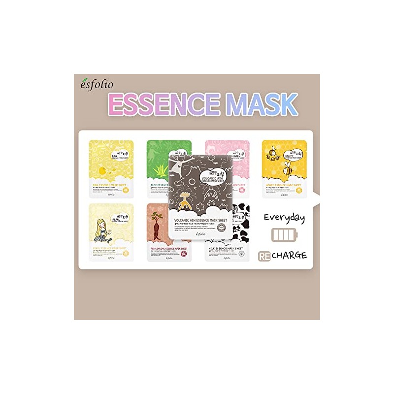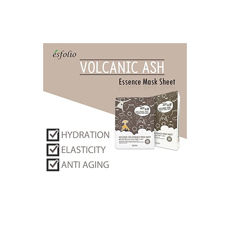 Esfolio Pure Skin Volcanic Ash Essence Mask Box. Contains Scoria Water whose inorganic substance is effective in removing keratin and skin wastes. Also, vitamins of Chaenomeles Sinensis Fruit Extract and Portulaca Oleracea Extract help to increase skin elasticity and moisturization.