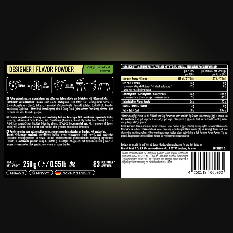ESN Designer Flavor Powder, Milky Hazelnut, 250 g, Flavour Powder for Sweetening, Low Sugar and Calories, Tested Quality, Made in Germany