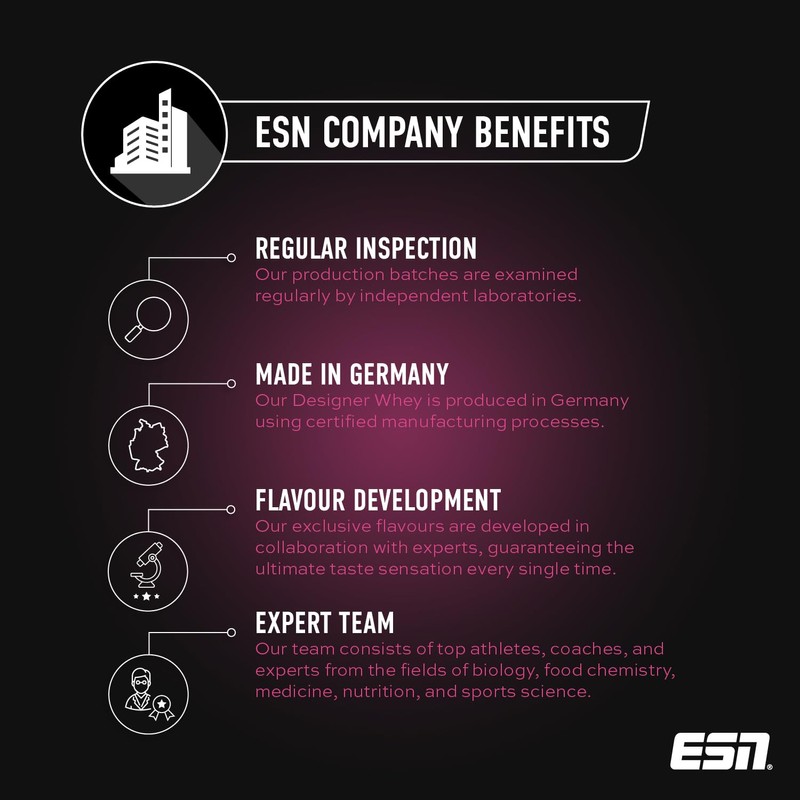• MADE IN GERMANY: ESN Designer Whey is manufactured in our own German production facilities using state-of-the-art equipment and the highest quality standards. We use only the purest and highest quality ingredients from the most renowned raw material suppliers