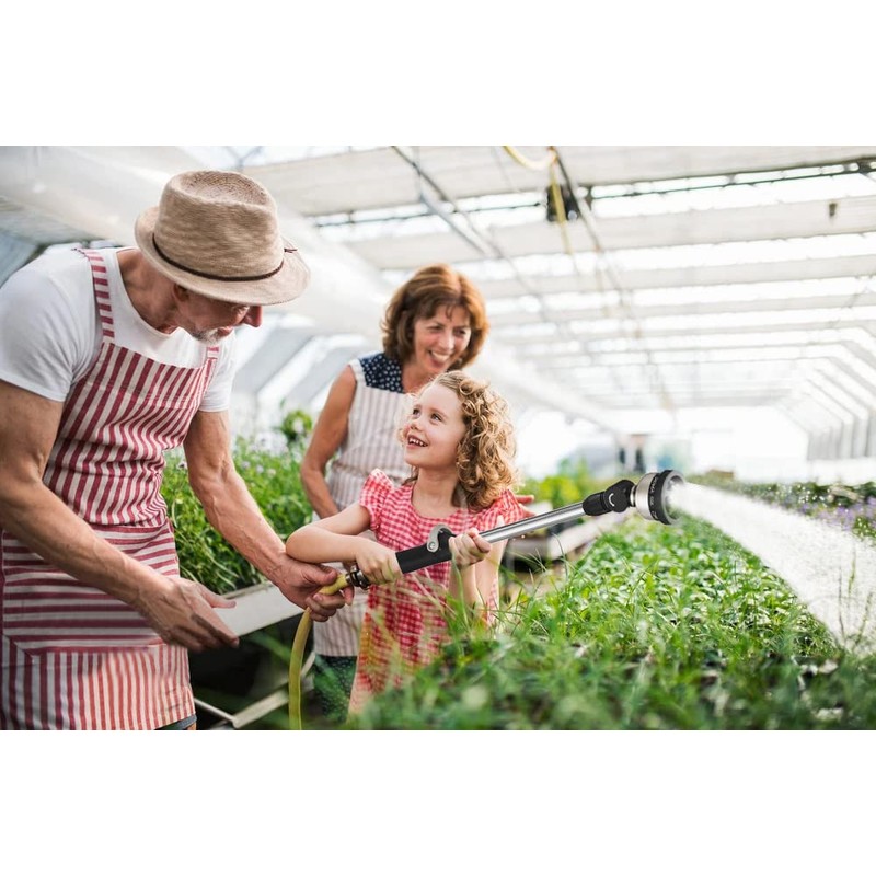 - 【100% HEAVY DUTY METAL】The adjustable garden hose sprayer wand is constructed of zinc alloy, aluminum alloy, and TPR for a tough lightweight and durable that's easy to grip and adjust. Slip resistant handle make this watering wand comfortable to use. Non-corrosive exterior that ensures strength and durability for extended nozzle life. The shock resistant rubberized bezel dial can enhance durability & flexibility and withstand hard impacts & heavy force in daily drops and shocks.