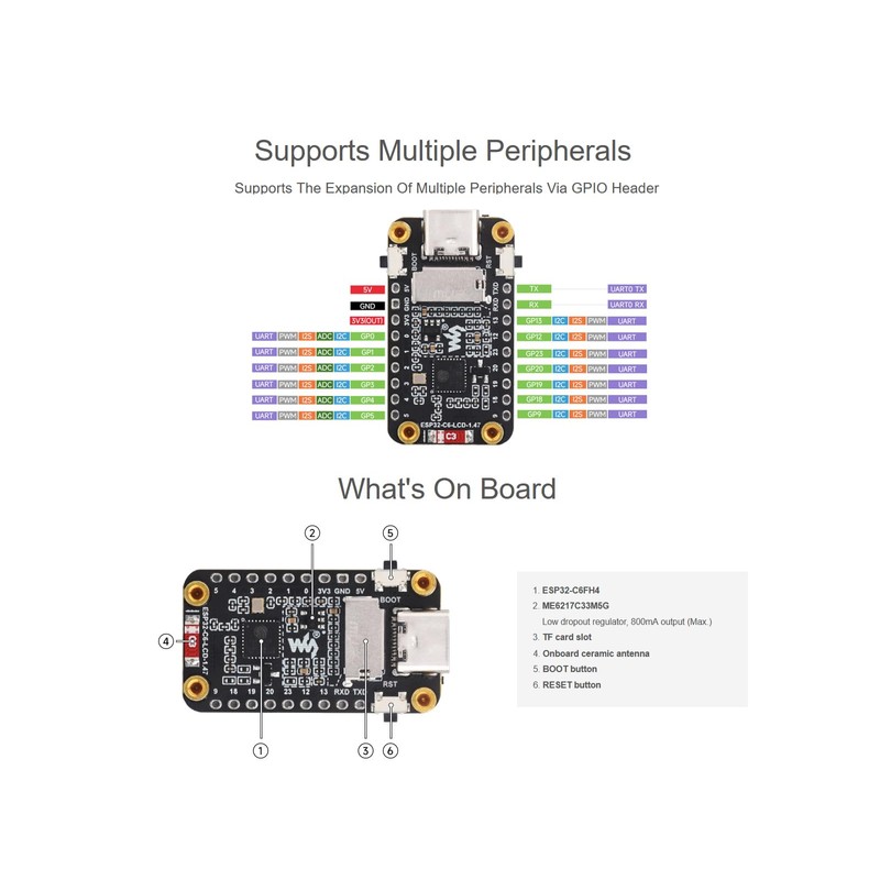 - Supports 2.4GHz Wi-Fi 6 (802.11 b/g/n) and Bluetooth 5 (LE), with onboard antenna, Built in 320KB ROM, 512KB of HP Static Random-Access Memory, 16KB LP Static Random-Access Memory and 4MB Flash memory