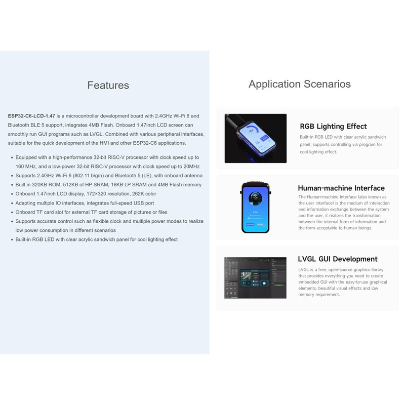 - ESP32-C6 1.47inch LCD Display Development Board with pre-soldered header, Onboard 1.47inch LCD screen can smoothly run GUI programs such as LVGL. Combined with various peripheral interfaces, suitable for the quick development of the HMI and other ESP32-C6 applications