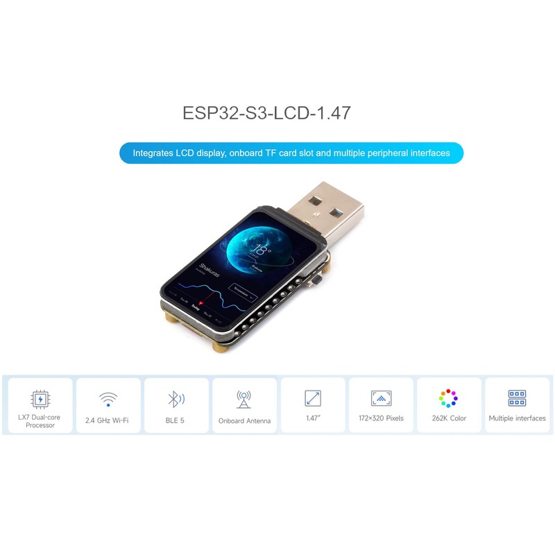 Onboard 1.47 inch LCD display, 172 x 320 resolution, 262 K colour.