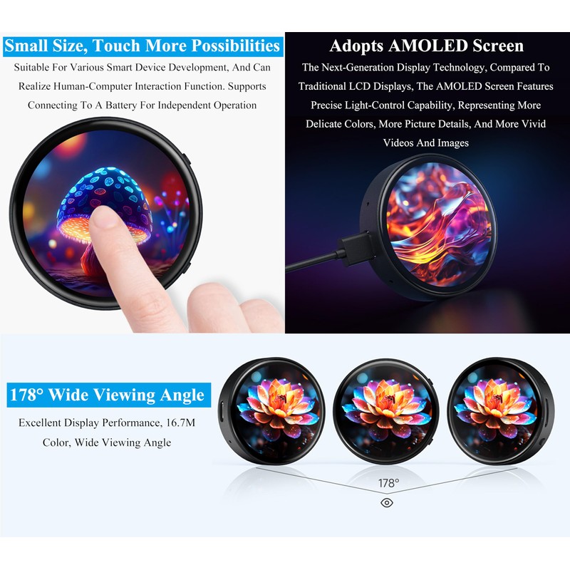 2. AMOLED Touch Screen: Onboard 1.75inch AMOLED capacitive touch display for clear color picture display, 466 x 466 resolution, 16.7M color, 178° wide viewing angle. Compared to traditional LCD displays, the AMOLED screen features precise light-control capability, representing more delicate colors, more picture details, and more vivid videos and images.