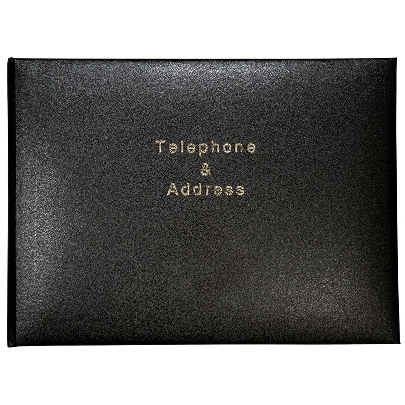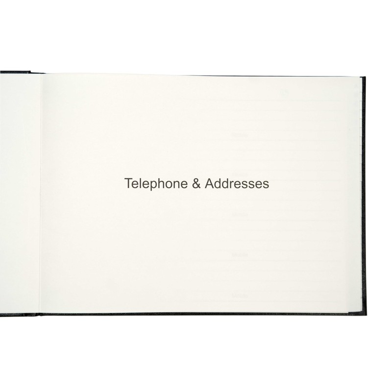 Introducing our Large Landscape Telephone and Address Book, designed to keep all your important contacts in one place. With its hardback padded vinyl cover and subtle grain texture, this book is stylish and durable enough to withstand everyday wear and tear. The black cover is complemented by gold foil-blocked lettering, adding a touch of sophistication to your personal or professional life. Here are the key features of our Telephone and Address Book: High-Quality Pages: The 64 white internal pages are made from 100gsm paper, making them thick enough to prevent ink from bleeding. With gold gilt edges, these pages add an elegant touch to the overall design. Large Landscape Format: The size of the book is 215 x 160mm, allowing you to have ample space to record all your contacts' information. The landscape format makes it easy to read and access your contacts' information. A-Z Index: The book includes a 26-step alphabetical A-Z index, making it easy for you to locate a specific contact. This index is printed on the edge of the pages, making it easy to see and access. Space for Entries: Each page has enough space for you to record names, addresses, email addresses, and telephone numbers. This format makes it easy to record all the essential information for your contacts in one place. Stylish Design: The book's stylish design is perfect for both personal and professional use. The cover's black colour and subtle grain texture give the book a classic look, while the gold foil-blocked lettering adds a touch of elegance. In conclusion, our Large Landscape Telephone and Address Book is an essential tool to keep all your contacts' information in one place. Its durable design, high-quality pages, and ample space for entries make it a practical solution for your contacts.