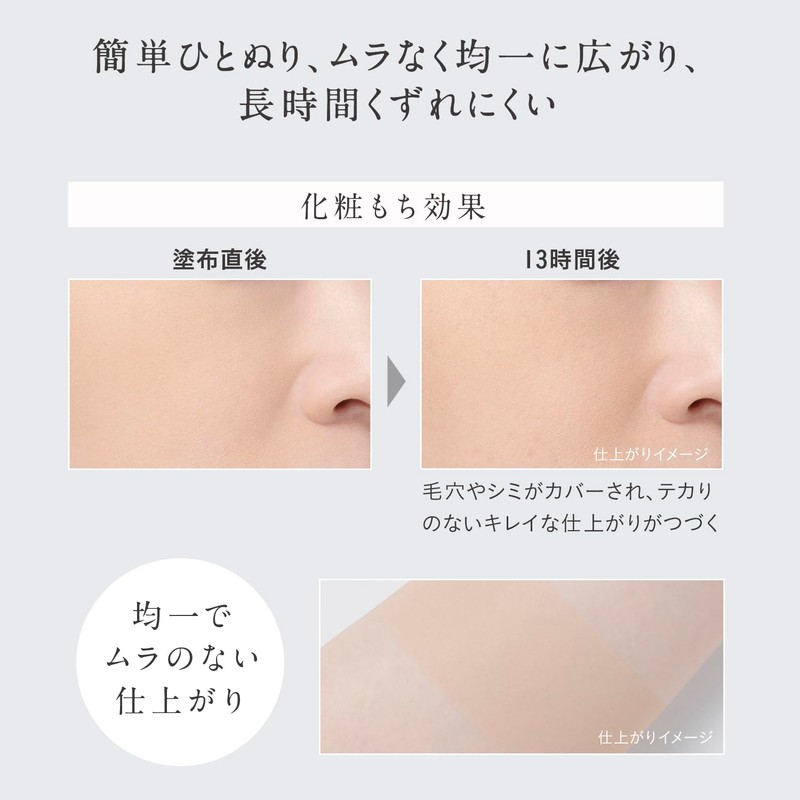 - It fits perfectly to any skin condition and has a natural finish that looks beautiful on your bare skin for a long time. 13-hour makeup mochi data acquired (sebum displacement, pores, pilling, dullness, and dryness) *According to our research. Effects may vary from individual