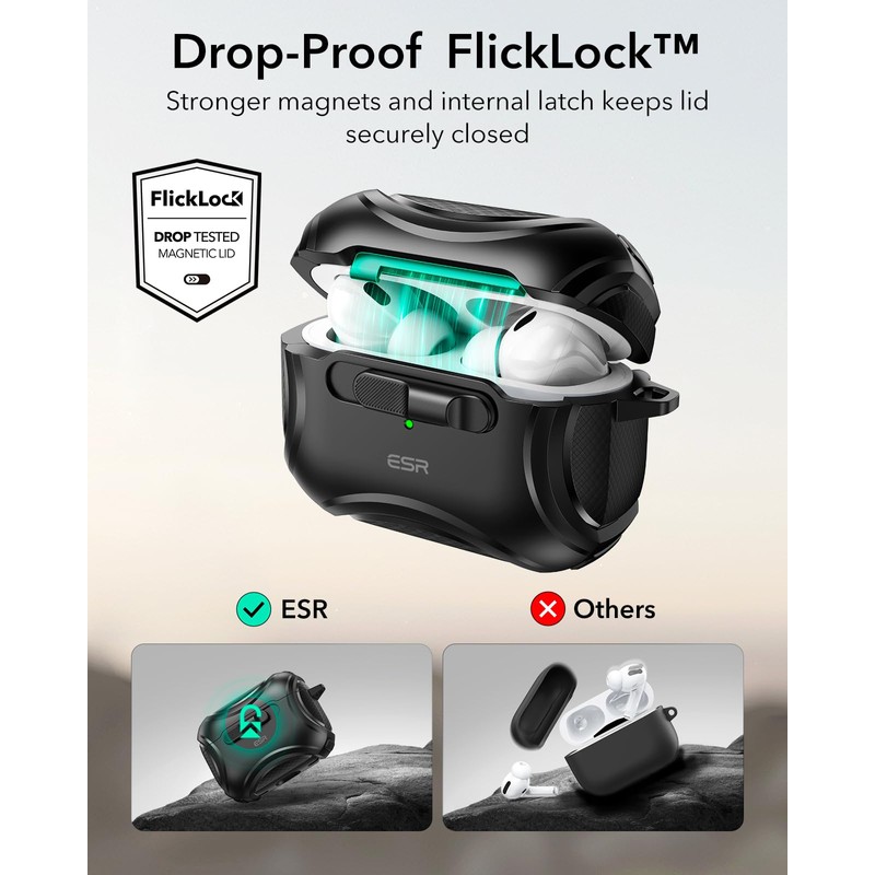 - Secure FlickLock: strong magnets with 700 g of holding force in the top and bottom of the lid and an internal latch keep your AirPods locked safely inside so they wont pop out if dropped