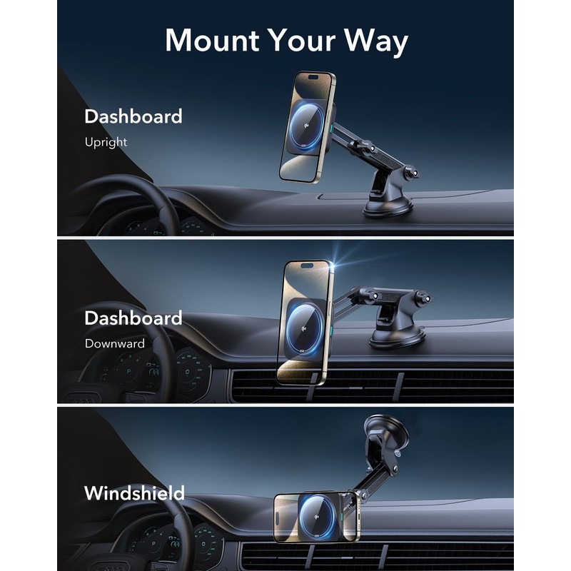 ESR for Qi2 15W MagSafe Car Mount Charger, Qi2-Certified MagSafe Car Charger, Dashboard/Windshield Magnetic Wireless Car Charging, Car Phone Mount for iPhone 16/15/14/13/12, S25, Fast Charging, Black