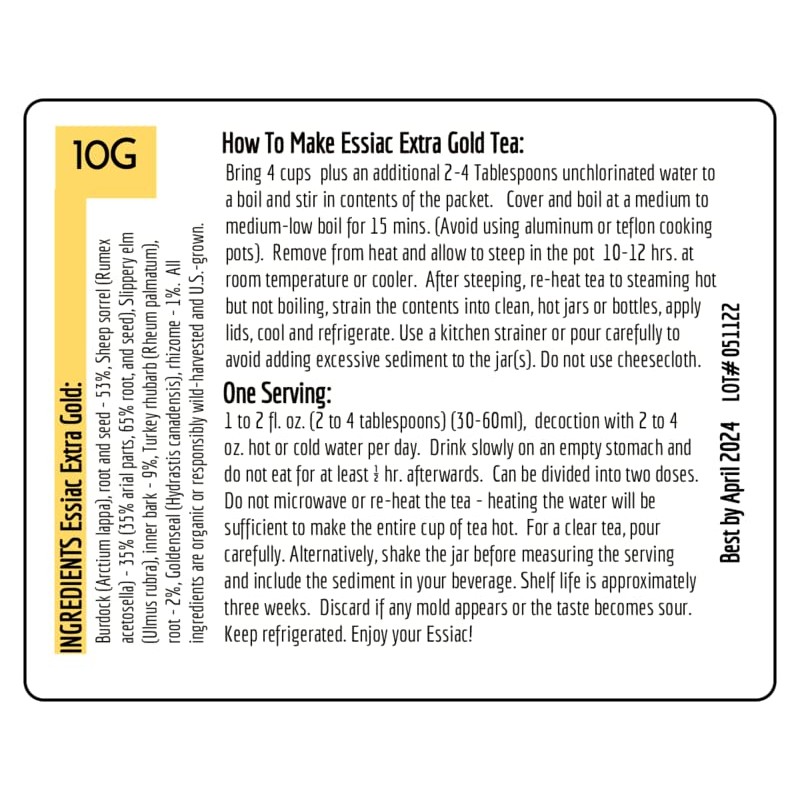 - Prepared the same as regular Essiac. 10g packets make 1 quart of decoction (concentrate). Refrigerate after opening..