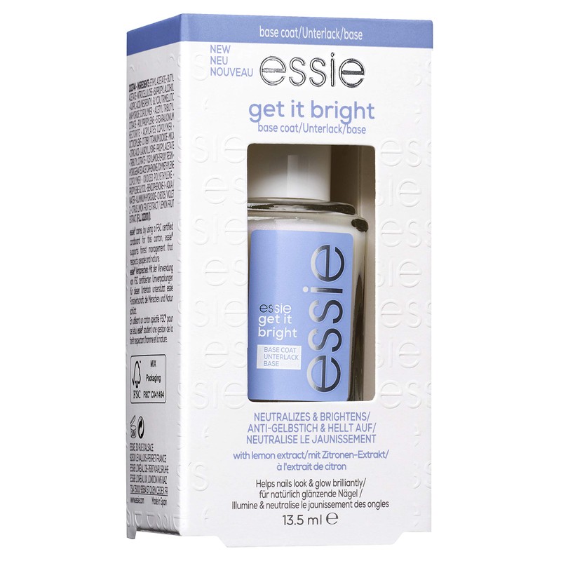 - Box contents: 1x essie base coat get it bright with outer packaging, colour: clear, capacity: 13.5 ml, weight: 58.2 g, HxWxD bottle: 7x3x3x cm, 3600531572105