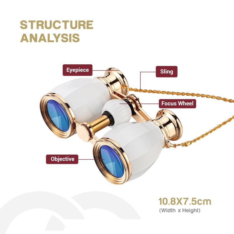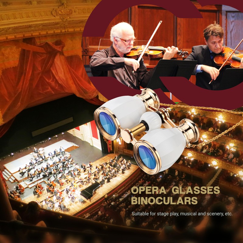 - Made of high quality aluminum alloy. These concert binoculars are durable and lightweight. The binoculars theatre comes with an updated delicate gold chain that will not shed, knot and break compared to the old chain with black lines.