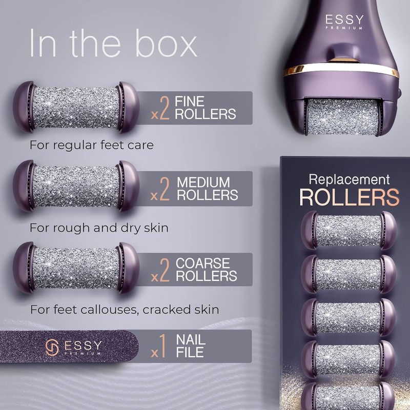 Essy Electric Foot File Hard Skin Remover with 5 Replacement Rollers Foot File Electric Pedicure Sets Cutters Accessories for Dry Dead Hard Skin Feet Callus Remover for Feet Care Exfoliator (Purple)