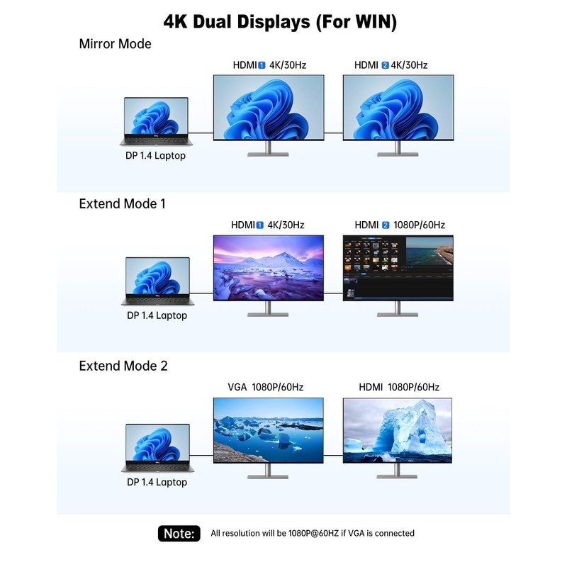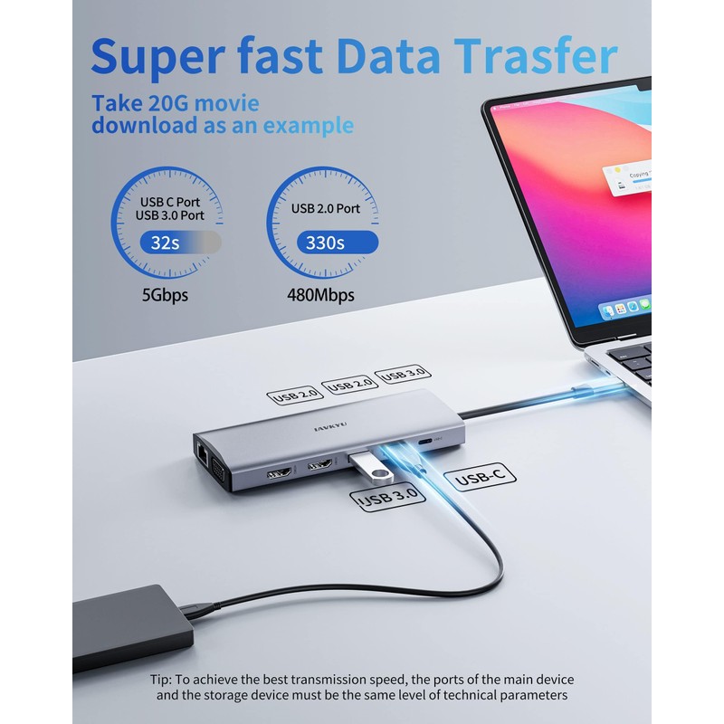 • Capacidad de visualización dual/triple: esta solución de acoplamiento USB C funciona como un concentrador USB para portátil y triplica como un adaptador multipuerto USB C Hub con estación de acoplamiento 3 monitores de funcionalidad. Equipado con dos puertos HDMI y uno VGA, ofrece hasta 4K@30Hz en modo de visualización dual y logra 1080P@60Hz en configuración de visualización triple. Permite una cómoda extensión de vídeo a pantallas externas más grandes, mejorando la comodidad visual y aumentando significativamente la productividad de la oficina.