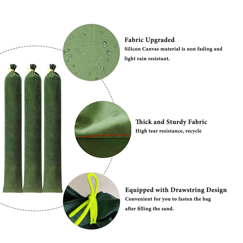 - The packages include: 2 x 3 x 8 inch sandbags for flood protection. REINFORCED SILICONE CANVAS Made of durable and tear resistant silicone canvas material for long-lasting reliability in flood protection scenarios.
