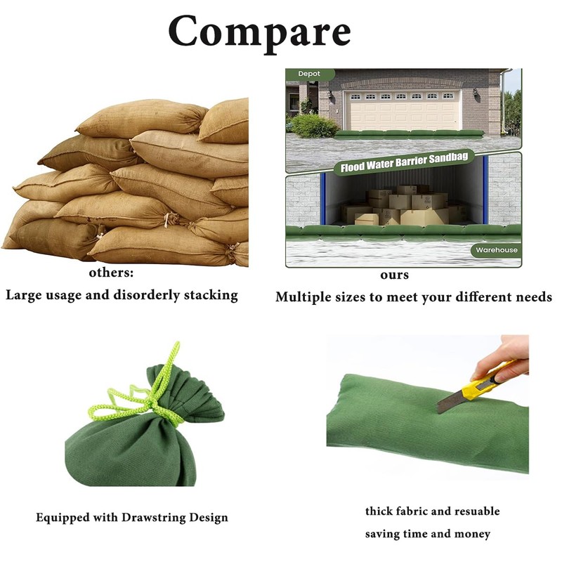 - REUSABLE DESIGN Designed for multiple uses, these sandbags can be easily dried and stored for future use, providing a cost-effective and sustainable flood protection solution.