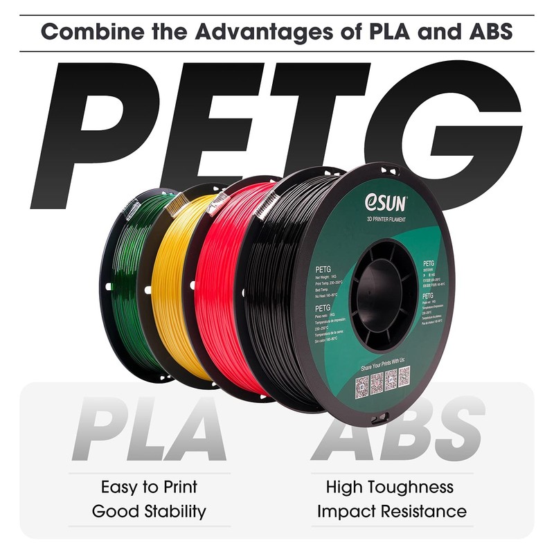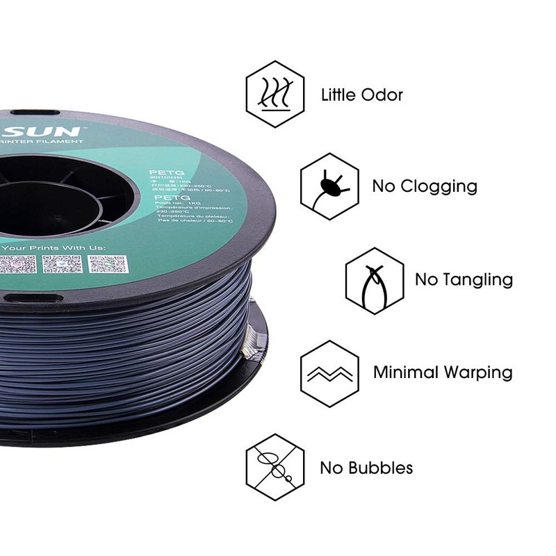 Advantages of PETG: PETG is an excellent material which combines the advantages of other filaments. Odorless; Little shrinkage rate; hydrophobicity (Does not absorb water); Outstanding toughness and high impact strength; Good liquidity (flows smoothly); High mechanical strength and excellent flexibility; Good glossy finish;