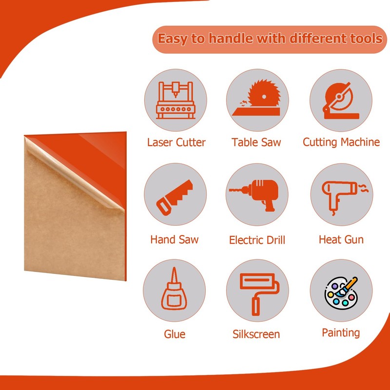 - 【Excellent Application】The Acrylic sheet is a great alternative to fragile glass and ideal materials for DIY, to make light boxes, pet ID tags, display stands, sun visors, table tops, switch panels of boats, windows, control panels signs, display stands, keychains, cake toppers, stands, model building, home decorations, holiday decorations, coasters, photo frames, stand-up signs, desktop protectors, and it is an excellent application for painting, advertising, and photography.