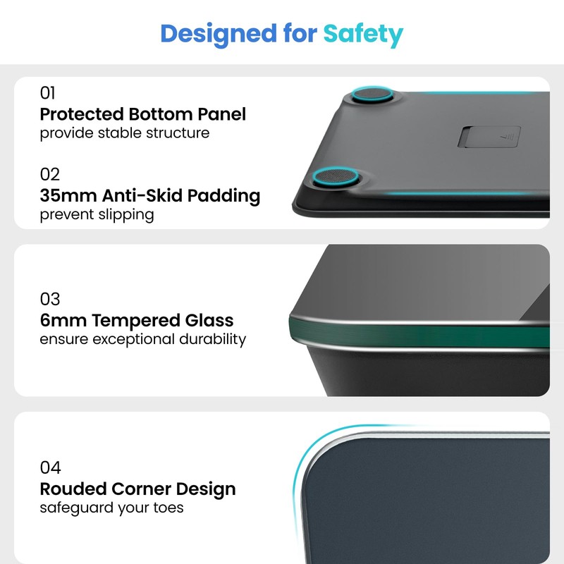 - Utmost Safe and Aesthetic: Expertly designed in Canifornia, our stylish scale can fit anywhere in your bedroom/bathroom/home. What's more, sleek round-corner design, large anti-skid padding and whole coverage bottom design provides durability and stability