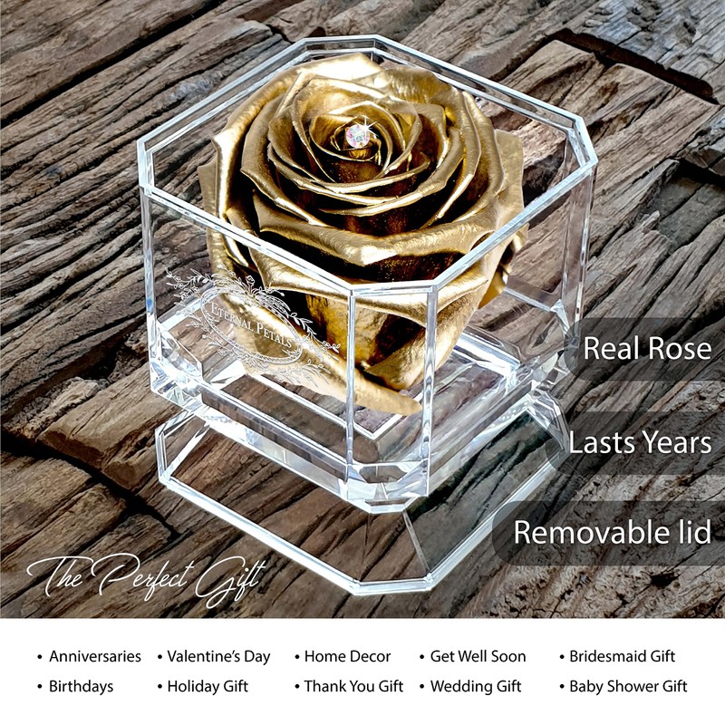 - ✮ TRENDY BOX – Arriving in this stunning 8cm x 8cm x 8cm Diamond box with a white gold Eternal Petals logo with a Multicolor crystal, you’ll find a perfectly bloomed, real rose in authentically beautiful colour. The ultimate in classic romance, this rose defies nature with its striking magical pigment, which you can enjoy and admire for years