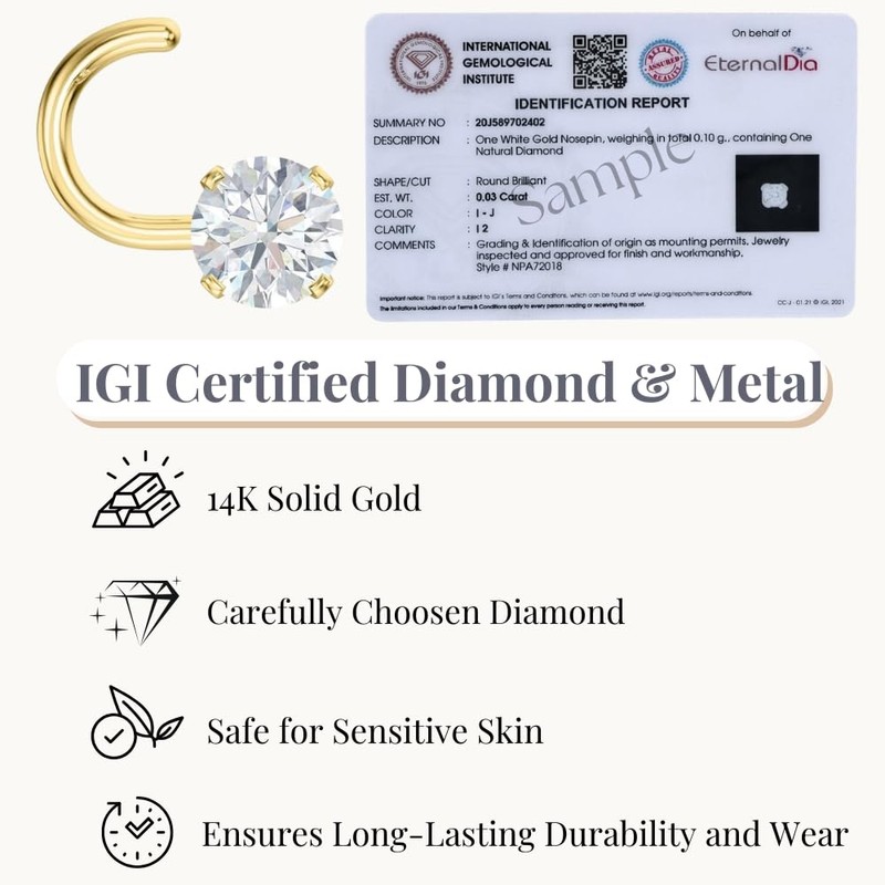 EternalDia IGI Certified Real Diamond Nose Stud With Twist Back 14K Gold Nose Stud in 18g & 20 Gauge/Diamond Nose Ring For Women/Diamond Color-I-J, Diamond Clarity- I2-I3/ 20g, White Gold Diamond