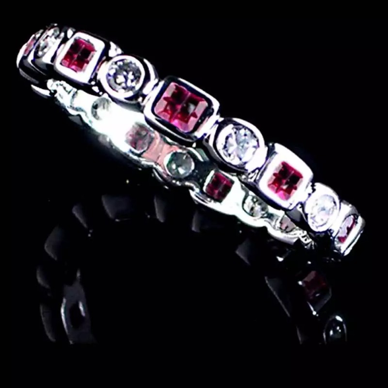 BRILLIANT- PRINCESS GEOMETRIC ETERNITY BAND RING GUARD... 2mm alternating round and square Clear and Ruby Red CZ eternity band. 925 Sterling Silver made with Grade A quality cut stones with a high-shine finish. Also includes a rhodium plate finish, which gives it its lustrous white gold appearance. All of our CZ pieces are always set and never glued on. NOTE: This ring also comes in alternating clear and Blue Sapphire CZ, Ruby Red CZ, Pink CZ and/or Green Emerald CZ. We also sell this is combo sets of 3 - you can SAVE when you purchase the Combo sets..... |