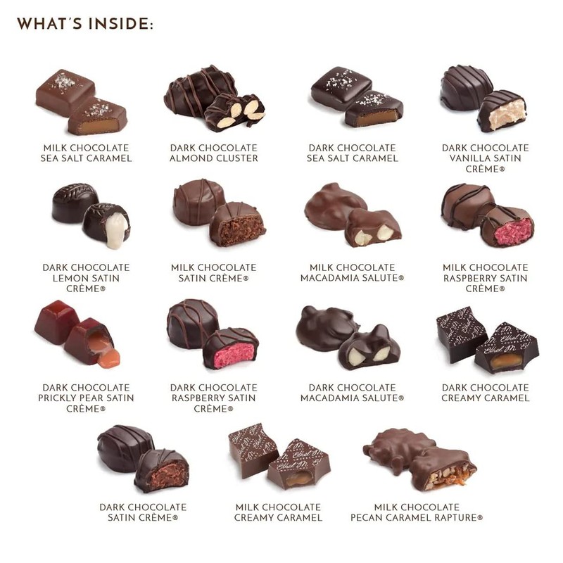 - FINE ASSORTMENT OF GOURMET CHOCOLATE most popular specialty premium chocolates including Lemon Satin Crme, Pecan Caramel Rapture, Almond Butter Krisp, Peanut Butter Milk Chocolate, Coconut Delight, and their original copper kettle Chewy Caramels