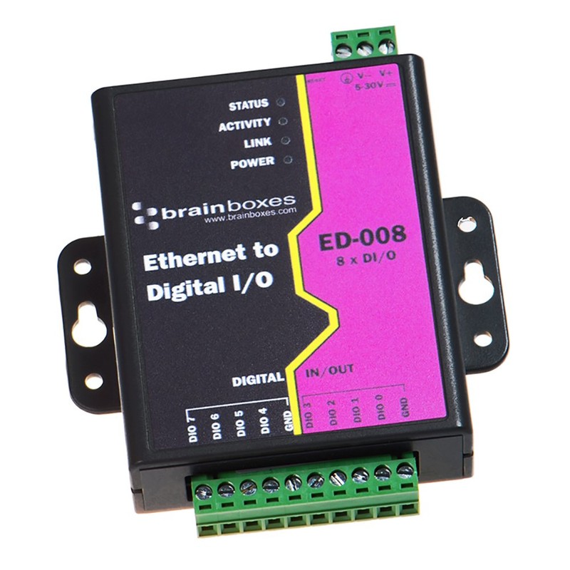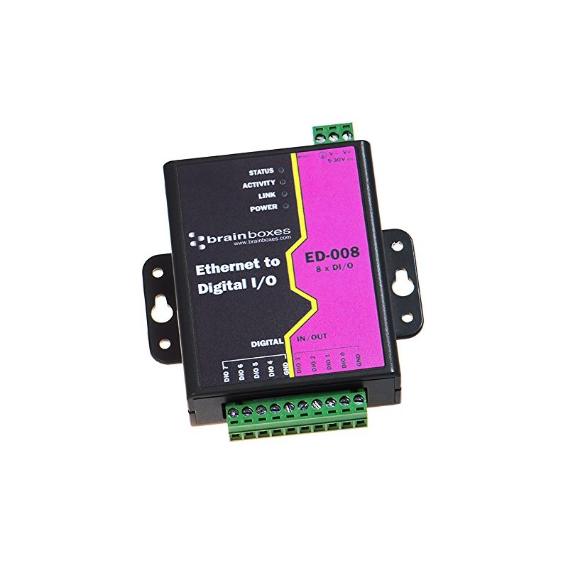 ED-008 Brainbox Ethernet to 8 Digital IO Ports - Comprises of 24 V input voltage, 8 digital input/output channels and 1 network port ED-008 Brainbox Ethernet to 8 Digital IO Ports offers fast Ethernet technology with 24 V input voltage, 8 digital input/output channels, 32 Bit CPU and 1 network port. It has 80 MHz processor speed and lifetime warranty. Dimension: 1"H x 4.5"W x 3.9"D. Form Factor: Rail Mountable. Warranty: Lifetime. Warranty: Lifetime.
