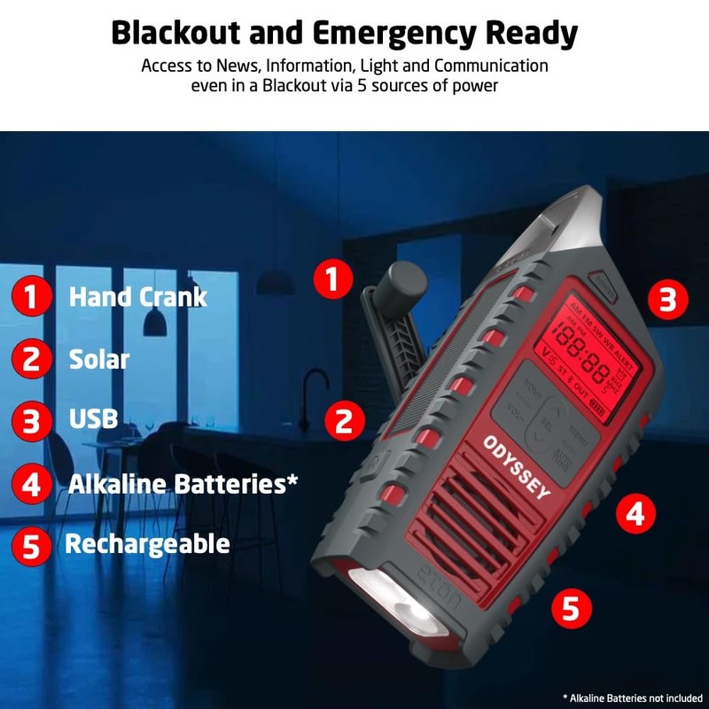 - Multiple Power Sources C The radio includes multiple sustainable power options: a solar panel to charge the internal battery via sunlight, and a hand crank for recharging during power outages or when off-grid. It's equipped with a rechargeable 2000mAh battery, ideal for staying powered during emergencies, storms or everyday use.