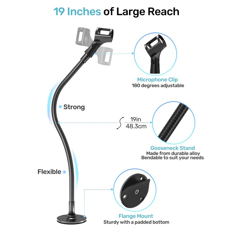 - [Durable and Adjustable Gooseneck Stand] Research has shown that the 19-inch gooseneck stand offers the perfect length for flexibility and stability. It is made of high-quality aluminum alloy and can hold up to 3.3lbs, ensuring that it won't sag over time. The gooseneck stand is easy to adjust and bend back and forth, allowing you to find the perfect angle for your microphone. On top of that, the gooseneck stand is rust-resistant and user-friendly with no noise when adjusting.