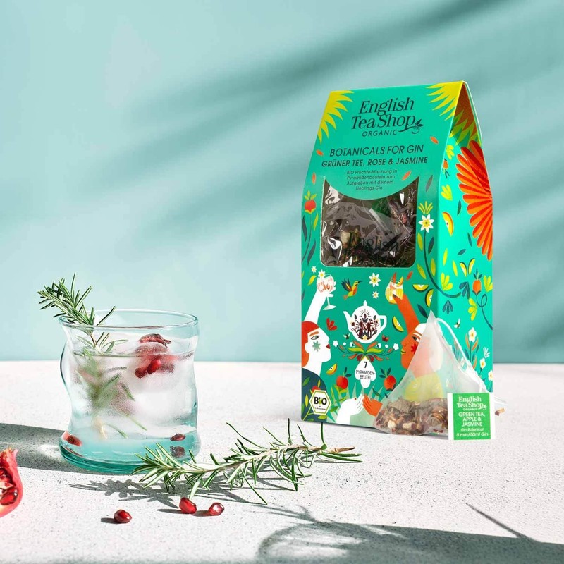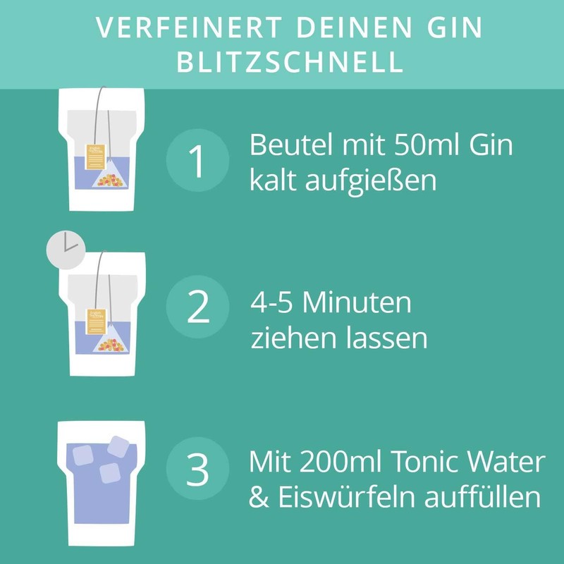 - Practical: Botanicals for Gin Green Tea, Rose & Jasmine in the pyramid bag simply let it steep in the gin for 5 minutes, if necessary Fill with tonic water. Done!