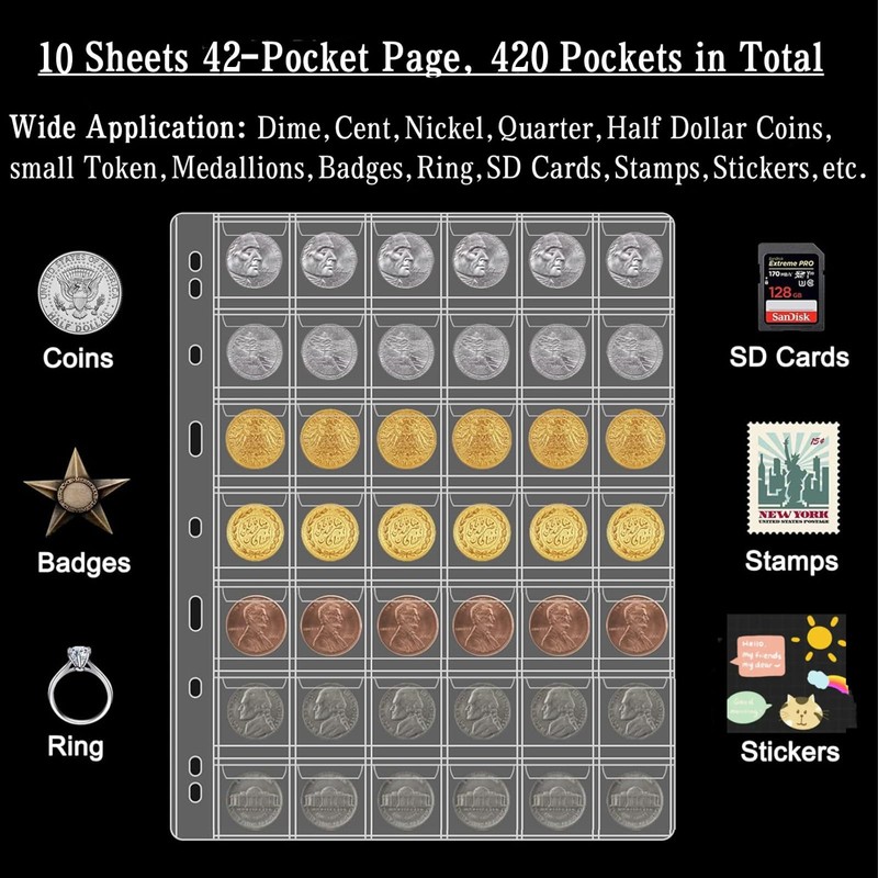 - 【10 Sheets 42-Pocket Coin Page】-- The package includes 10 sheets coin collecting pages, 42 Pockets per sheet. Pocket Size: approximately 1.14x1.14 inch. Suitable for storing most sizes of coins, medallions , ring, badges etc.