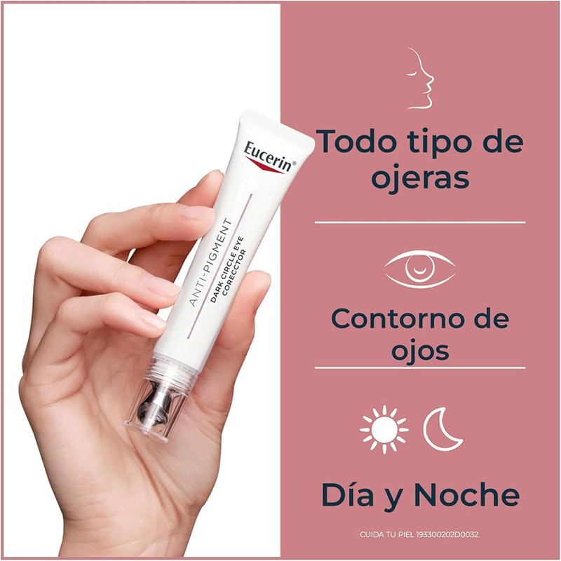 Eucerin Anti-Pigment Crema de Ojos 15ml, Anti Manchas y Anti Ojeras, Reduce las arrugas y líneas de expresión, Hidrata intensivamente, Piel Radiante y más luminosa Fórmula con Thiamidol, Licochalcona A y Ácido Hialurónico. Crema Anti-Ojeras especialmente formulada para reducir la hiperpigmentación y mejorar la luminosidad en la delicada área del contorno de los ojos. Su fórmula ligera y fresca actúa en el origen de las ojeras, proporcionando un aspecto más despierto y fresco desde la primera aplicación. -Thiamidol: Este ingrediente patentado es altamente eficaz en reducir la producción de melanina, tratando la raíz de la hiperpigmentación y ayudando a unificar el tono de la piel para una mirada más clara y radiante. -Pigmentos Reflejantes de Luz: Los pigmentos iluminadores presentes en la fórmula ayudan a reflejar la luz en el contorno de los ojos, dando un efecto luminoso inmediato y un aspecto más descansado y fresco. -Ácido Hialurónico: Con su poderosa capacidad hidratante, el ácido hialurónico ayuda a reducir las bolsas bajo los ojos y a suavizar las líneas finas, dejando la piel más hidratada y suave. -Oligopéptidos: Estos ingredientes estimulan la producción de colágeno, mejorando la estructura dérmica de la piel y ayudando a reafirmar la zona del contorno de los ojos para un look más juvenil y firme. Tratamiento ideal para iluminar el contorno de los ojos, suavizar las líneas de expresión y reducir la hiperpigmentación. Resultados visibles después de 2 semanas de uso regular.