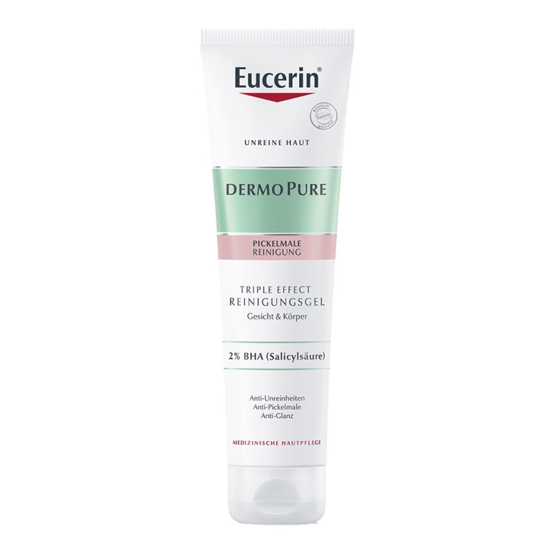 The Eucerin DermoPure Triple Effect cleansing gel with 2% salicyls ure helps to finally defeat blemishes, pimples and shine with triple effect: