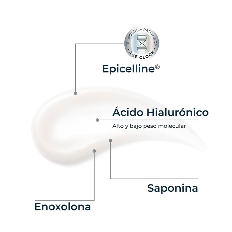 • Formulada con TOP ingredientes activos: 1. Epicelline 2. Ácido hialurónico de doble peso: Penetra profundamente para rellenar arrugas 3. Glicerina Saponina: Bio-estimula el ácido hialurónico, el colágeno y elastina propio de la piel 4. Enoxolona: Reduce la degradación del Ácido Hialurónico