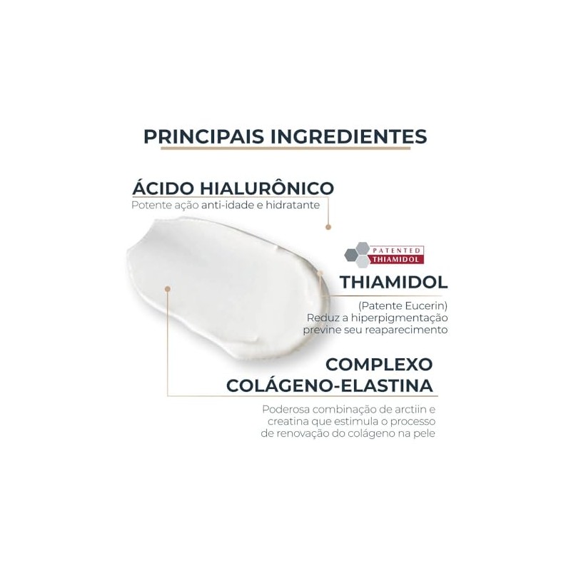- Elastina, una potente combinación de Arctiina y Creatina, revitaliza la producción de colágeno y ayuda a aumentar la elasticidad de la piel. El Thiamidol patentado por Eucerin reduce la aparición de manchas de la edad. Para una piel más suave, radiante y visiblemente más joven. La crema facial de día también contiene FPS 30 y un filtro UVA para prevenir eficazmente el envejecimiento prematuro de la piel inducido por los rayos UV y la profundización de las arrugas.