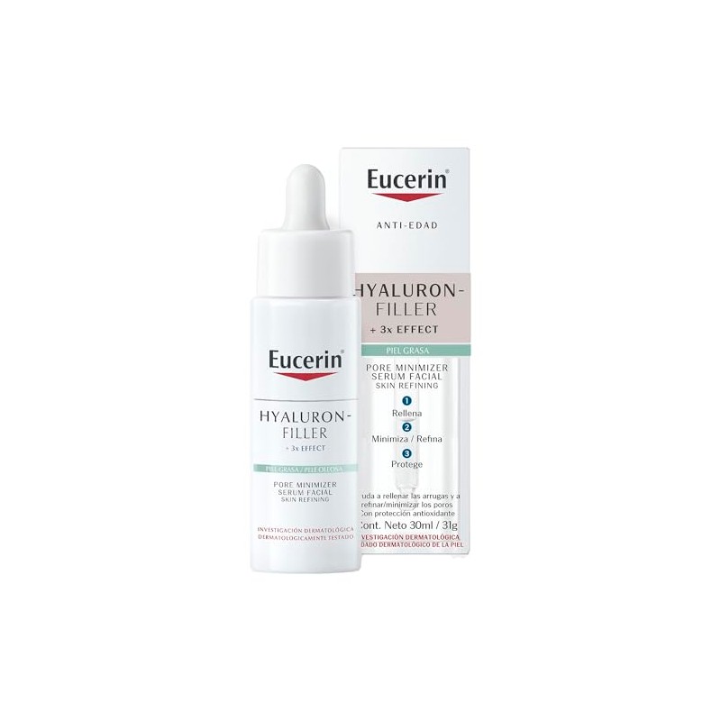 Eucerin Hyaluron-Filler + 3x Effect Serum Facial (30ml) Minimizador de poros, Rellena, Reafirma y Protege. Ayuda a rellenar arrguas con protección Antioxidante, para una piel mas lisa. Combate los primeros signos de envejecimiento y afina los poros con el nuevo serum refinador de la piel Hyaluron-Filler de Eucerin. Este serum ultraligero contiene tres activos clave, como el Ácido Hialurónico, el Ácido Glicólico y el Ácido Láctico, que dejan la piel sedosa. Su fórmula con antioxidantes también protege la piel contra los radicales libres y los daños causados por los agresores ambientales. El serum anti oxidante refinador de la piel es adecuado para la piel que muestra los primeros signos de envejecimiento, como líneas de expresión, poros dilatados o piel áspera o apagada. Su textura ultraligera y no grasa hace que este serum facial sea excelente para quienes tienen la piel grasa o para aplicarlo bajo el maquillaje.