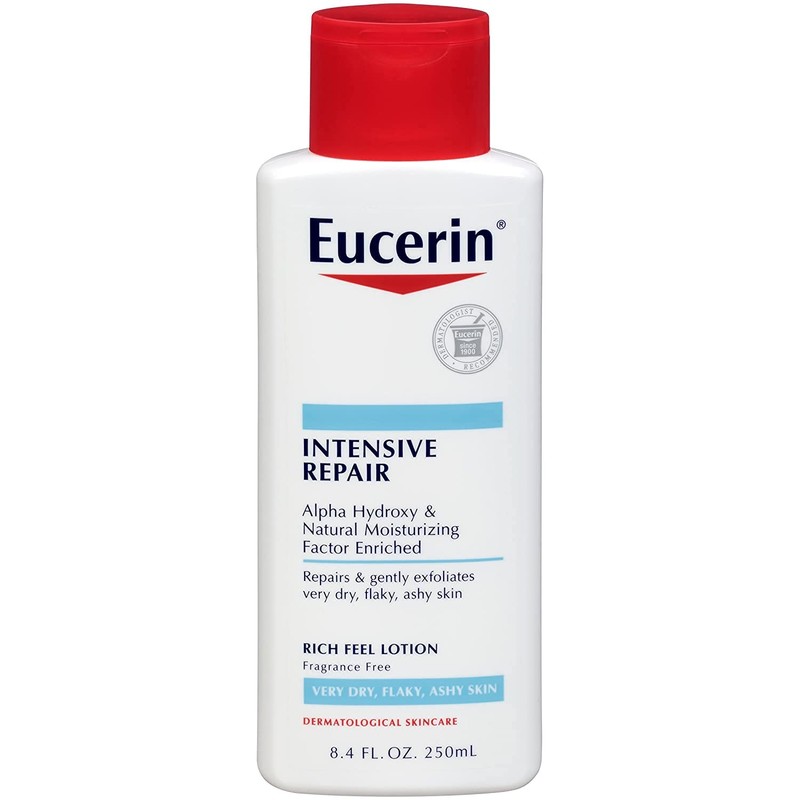 Eucerin Intensive Repair Lotion 8.4 oz - Eucerin Intensive Repair Body Lotion immediately restores the skin’s radiance and delivers 24-hour hydration. This Eucerin Intensive Repair lotion contains a unique 3-dimensional formula that is enriched with Alpha Hydroxy and Natural Moisturizing Factors, and moisturizes exfoliates, and conditions very dry flaky skin. The intensively moisturizing formula in this unscented body lotion immediately improves the skin’s appearance. This Eucerin body lotion is fragrance-free, dye-free, and paraben-free, so it's ideal for those with sensitive skin and is gentle enough for use as a daily dry skin repair lotion. This body moisturizer is perfect as a very dry skin lotion, and can also be used as a hand lotion or foot lotion. To use, smooth this Eucerin-sensitive skin lotion onto your body daily. Eucerin is a dermatologist-recommended skincare brand that is based on an uncompromising approach to science. With skin care products designed to restore and sustain healthy-looking skin, families everywhere look to Eucerin to enhance outer beauty and self-confidence.