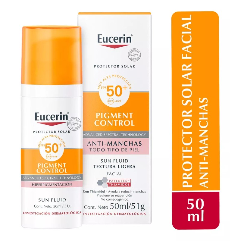 Eucerin Protector Solar Facial Pigment Control FPS 50+ 50ml es un avanzado cuidado dermatológico para todo tipo de pieles que previene la hiperpigmentación causada por la exposición solar. Formulado con el ingrediente patentado Thiamidol, eficaz en la reducción de manchas oscuras y en la prevención de su reaparición.