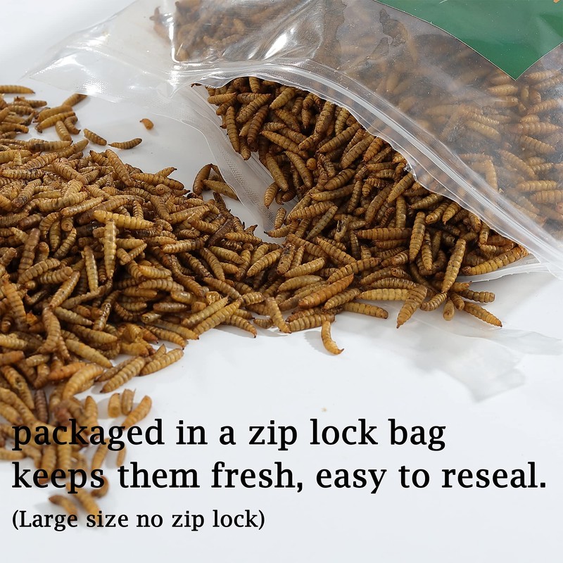 - 【EASY TO STORE & KEEP FRESH 】 - Our black soldier fly larvaes are packaged like mealworms in a zip lock bag that keeps them fresh, easy to reseal. And thanks to the drying process you can store our black soldier fly larvae for up to 12 months in a cool, dry space without the need of refrigeration(Large size no zip lock)