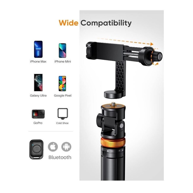 • [Wide Compatibility] Eucos makes no compromises when it comes to quality, A precision-crafted 1380mm extension rod extends smoothly and uniformly, which can up capture device to 62" and securely holds smartphones from 2.0"-3.6" in size wide. Such as iphone 13 pro max/ 13 pro/ 13, iPhone12 Pro Max/ 12 Pro / 12 12 mini, iPhone SE / 11, Samsung Galaxy S22 Ultra, OnePlus, etc.