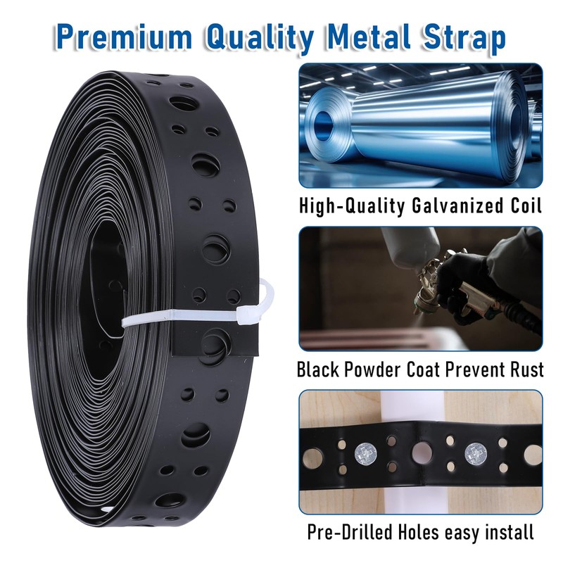 - Unmatched DurabilityConstructed from high-strength carbon steel and designed with a galvanized metal base, our black metal strap is coated with a black powder finish for double-layer protection against rust and corrosion. Engineered for both indoor and outdoor use, the strap delivers exceptional tensile strength and durability, ensuring a secure and lasting hold on your projects.
