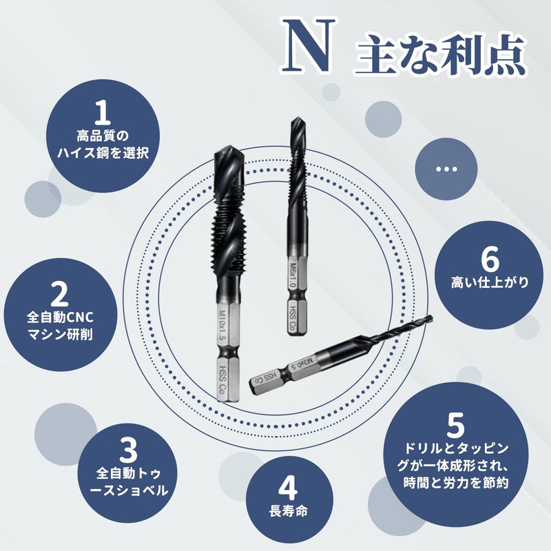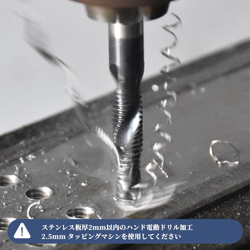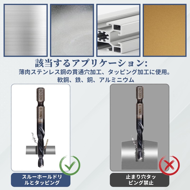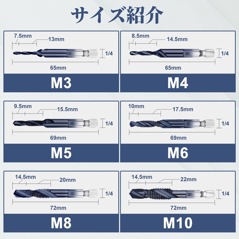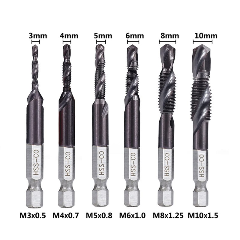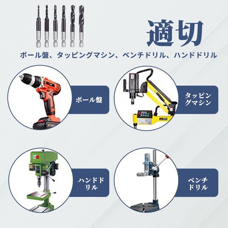 • [Uses] This tap bit is suitable for drill press, tapping machines, tabletop drills, and hand drills. Please handle with care when using hand drills. Excessive swinging and tilting will affect the tap and may damage the tap. M3-M6 is an electric hand drill, and the M8-M10 is suitable for tabletop drills