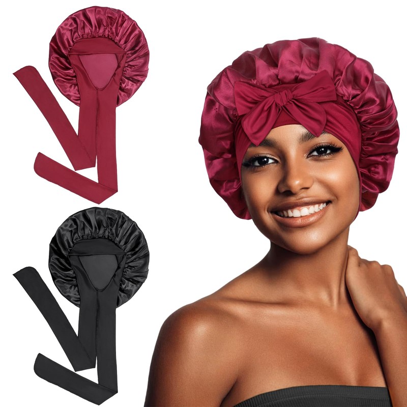 Euqvunn Pack of 2 Black Silk Bonnet for Sleeping, Sleep Cap Hair Protect with 6.2 x 63 cm Widening Tie, Hair Cap for Night, Protection for Long/Straight/Curly Hair (Black Red)