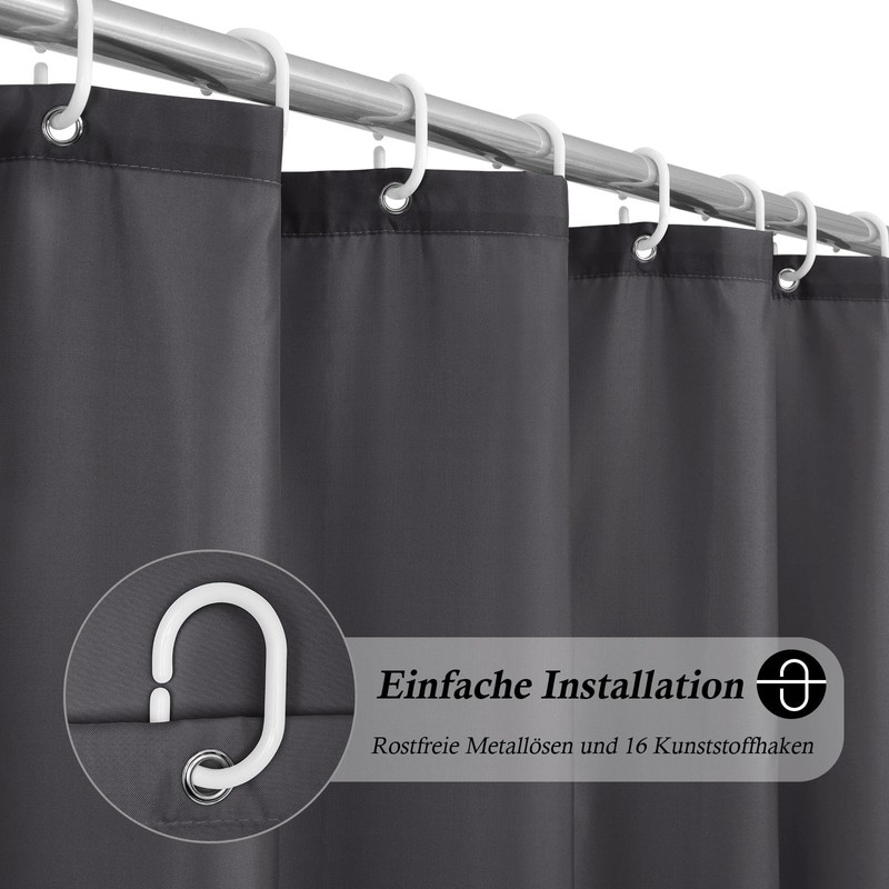 EurCross Wide Shower Curtain 240 x 180 cm Textile Fabric Washable Bathroom Curtain for Bathroom Bathtub, Dark Grey Waterproof Anti-Mould Shower Curtains with 16 Rings