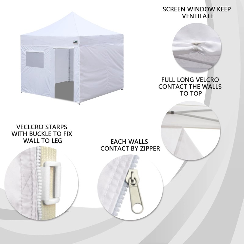 - 4 Zipper End Sidewalls(3 Solid walls + 1 Zip Door Wall with roll up door screen window).