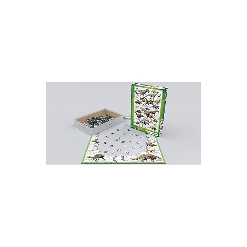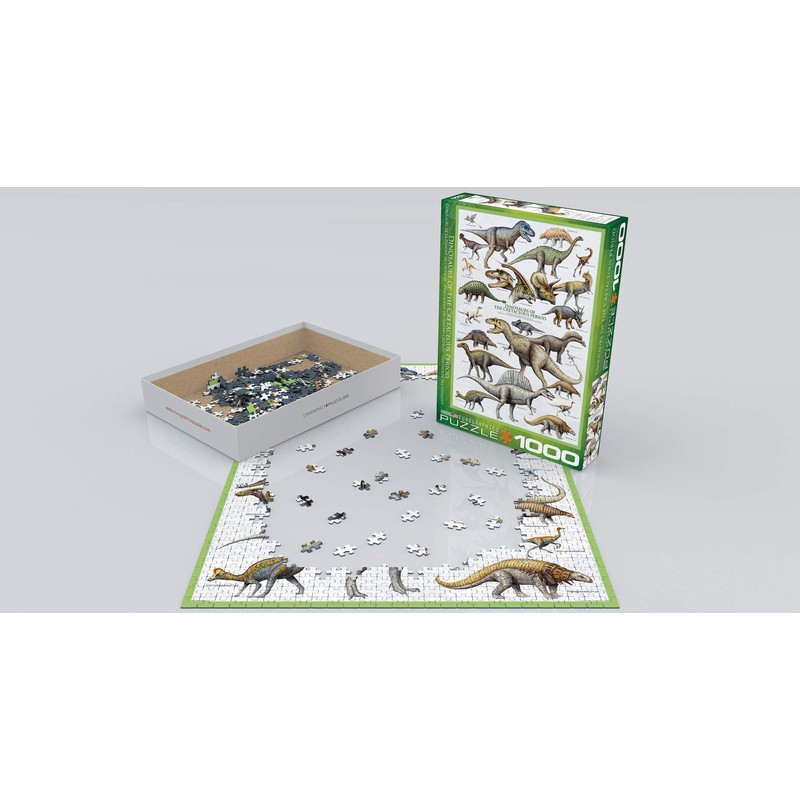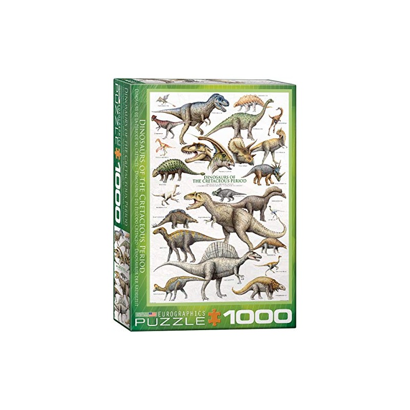 EuroGraphics Dinosaurs Cretaceous 1000-Piece Puzzle. Box size: 10" x 14" x 2. 37". Finished Size: 19. 25" x 26. 5". The Cretaceous period (144-65 million years ago) may have seen more dinosaurs than ever before. Over 20 of the most fascinating creatures are illustrated, such as giganotosaurus, tyrannosaurus and triceratops. Strong high-quality puzzle pieces. Made from recycled board and printed with vegetable based ink. This superior quality puzzle will delight and educate all at the same time.